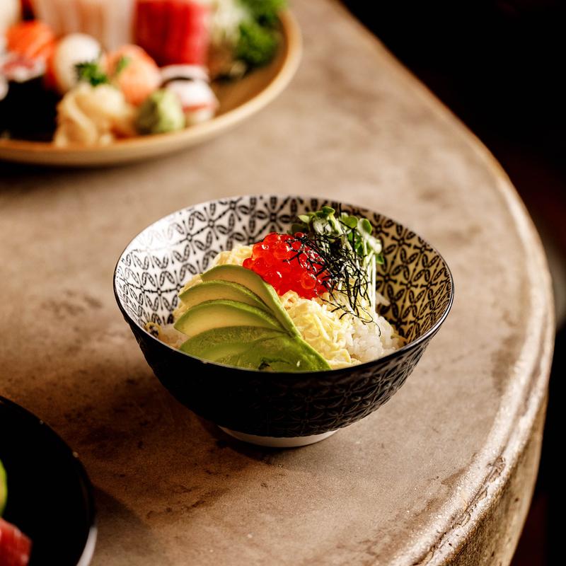 Cooked salmon, avocado, egg, kaiware sprouts, and salmon caviar over sushi rice